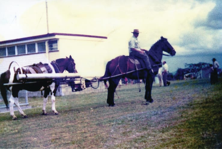 Pictured in 1977 at Theebine School, is a two-horse spray outfit built by my dad’s cousin, Vic Wilson, around 1970. He owned nearly half of Devil’s Mountain at Sexton, via Gympie, Qld, which during this time period had a bad infestation of Nagoora Burr, and much of the mountain was only accessible by horse.