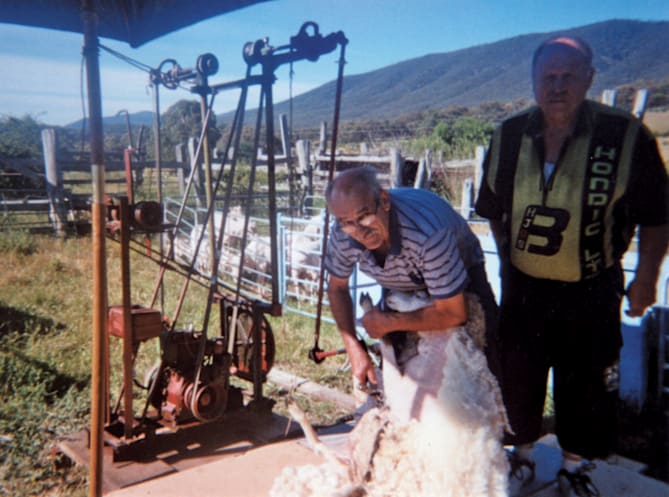 This is a photo of my 1969 Sunbeam Little Wonder shearing plant which has a Ronaldson & Tippett motor, together with shearer, Ian Smith and myself, both from the Bathurst area, NSW.
